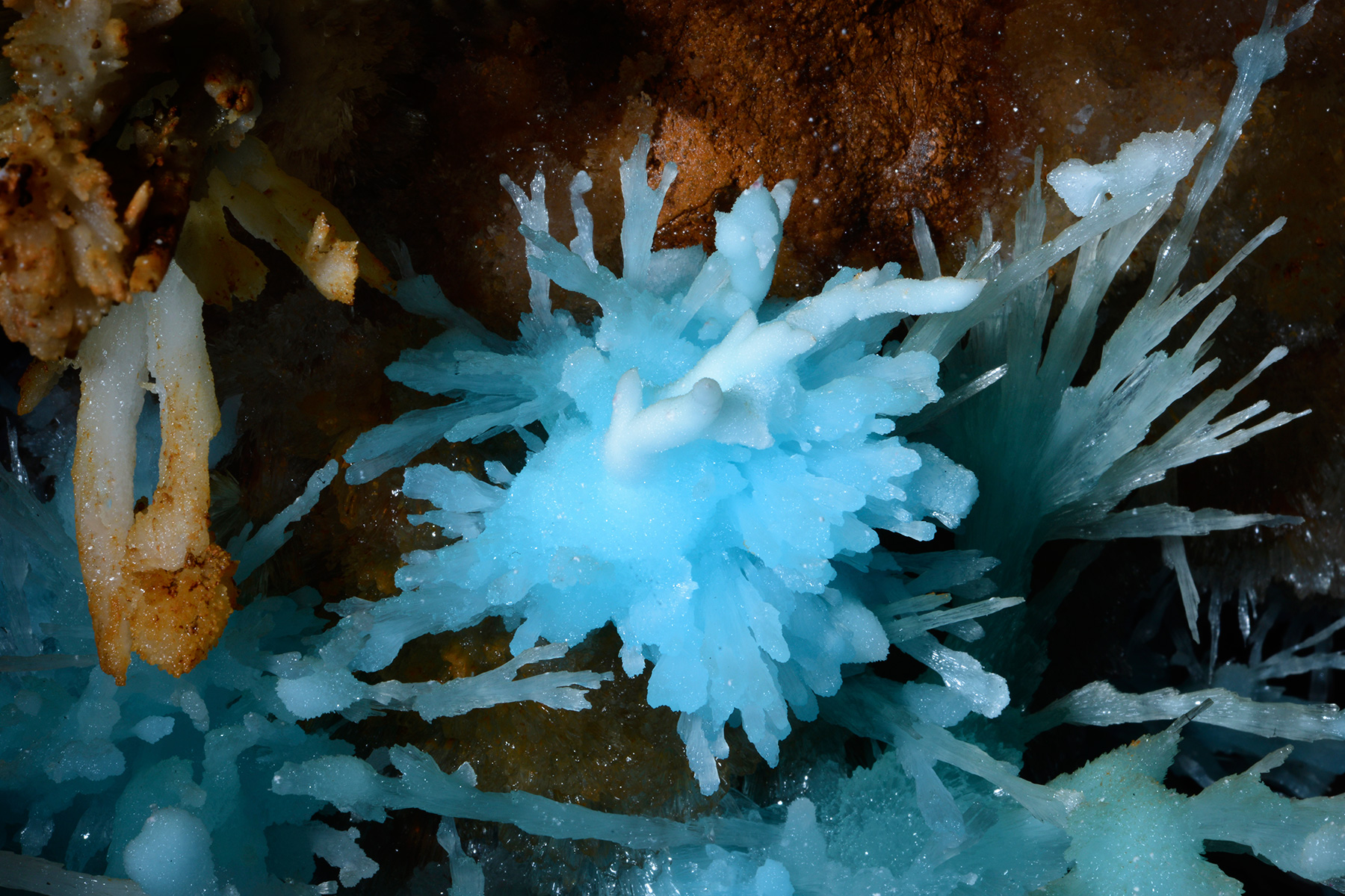 L'aven des Crozes dans l'Hérault présente des concrétions colorées (aragonites bleues) uniques en leur genre