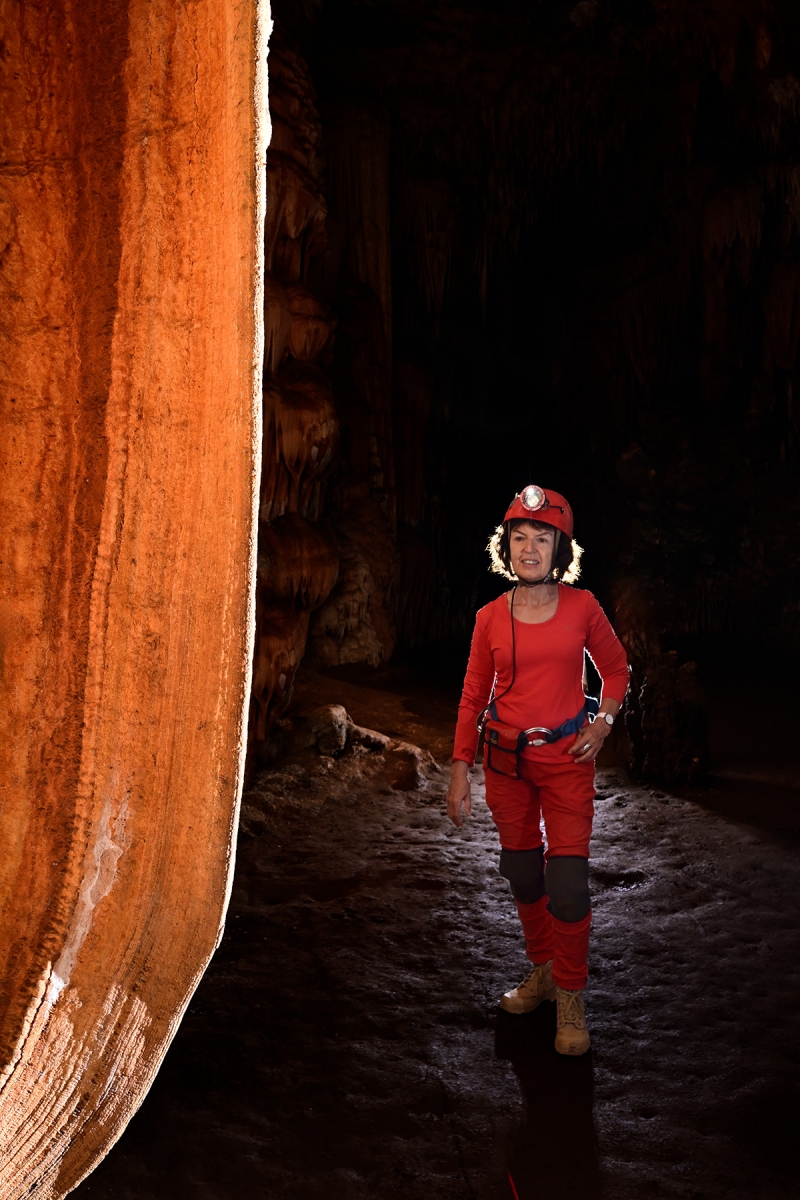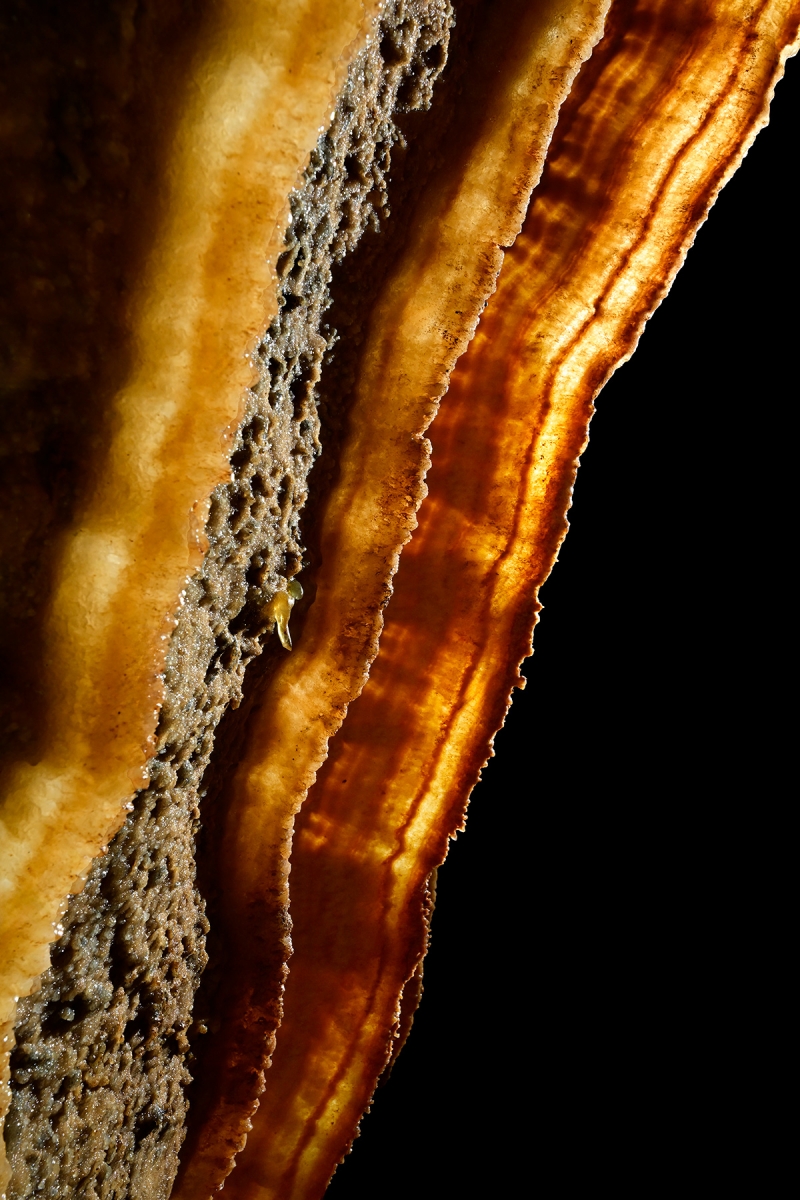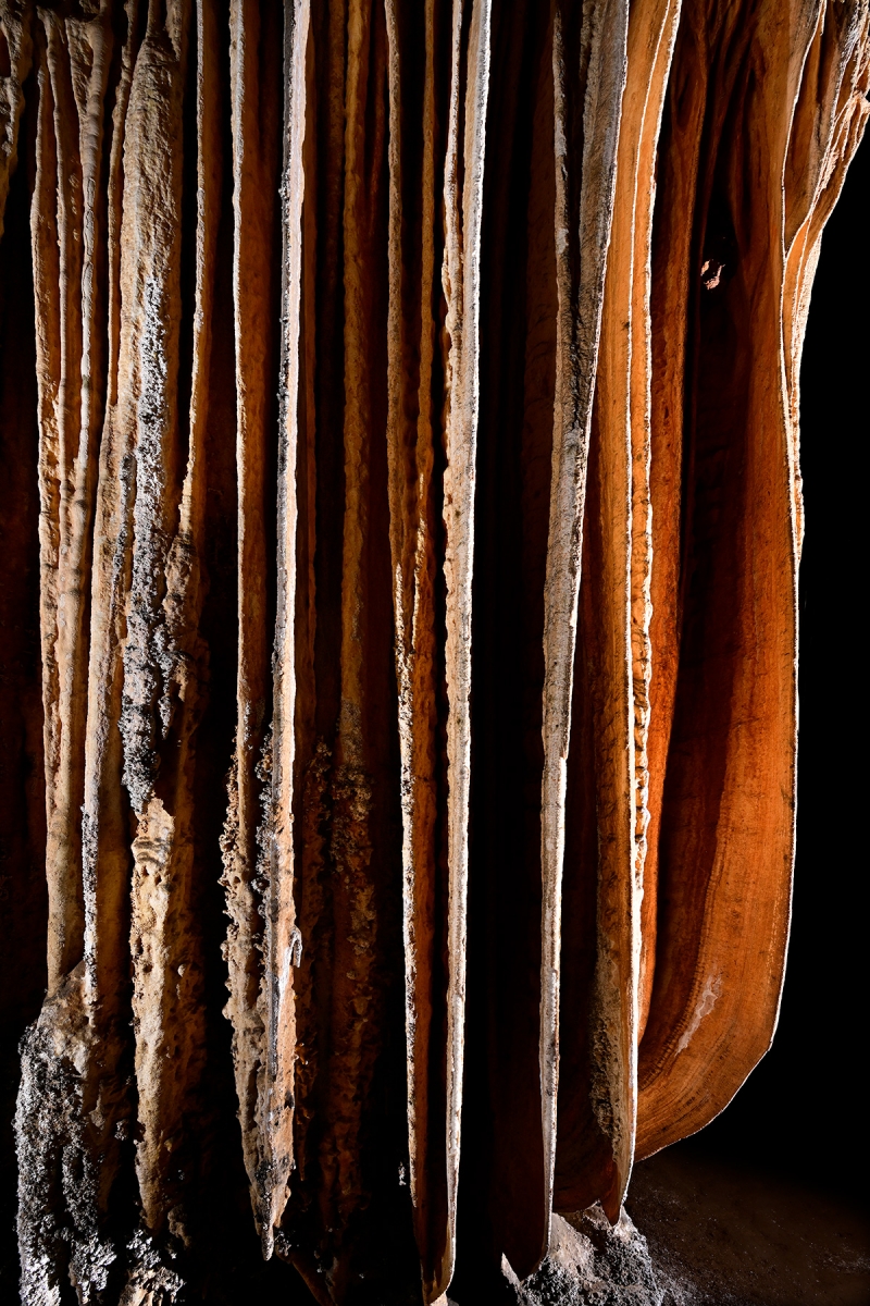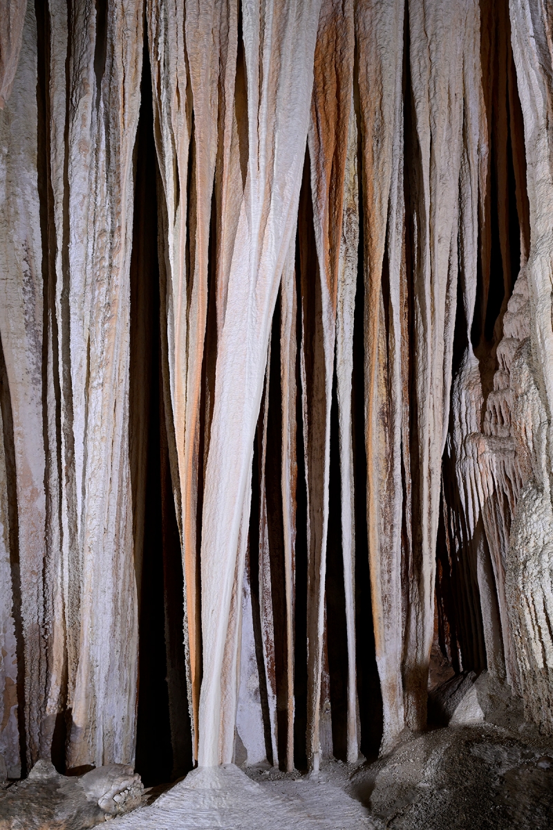 Les draperies sont constuituées par une des cristallisations en frange due aux suintements sur une voûte inclinée. Leur finesse permet souvent d'en deviner les stries de croissance par transparenc. Les disques apparaissent à la voûte ou sur les parois des cavités. Ils sont constitués de deux parties superposées, séparées par un espace plan de quelques millimètres par où l'eau arrive d'une fissure sous forte pression. L'eau contribue ainsi à l'agrandissement de la plaque, tout en alimentant un alignement de stalactites généralement situé sur leur pourtour inférieur.