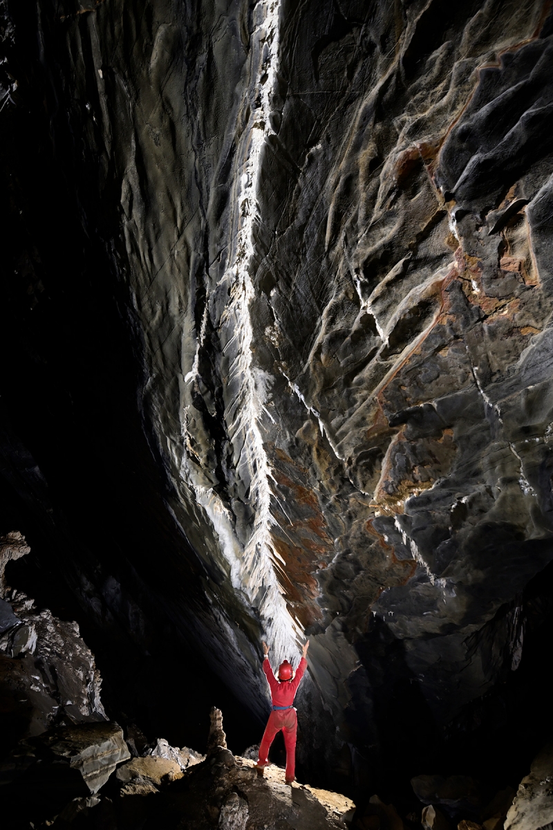 Grotte de Vallorbe (Suisse) - Spéléo éclairant avec sa lampe Scurion une cascatelle