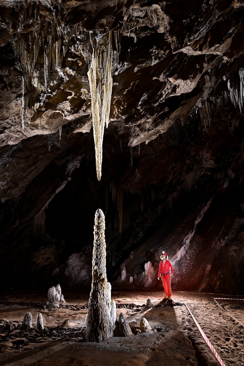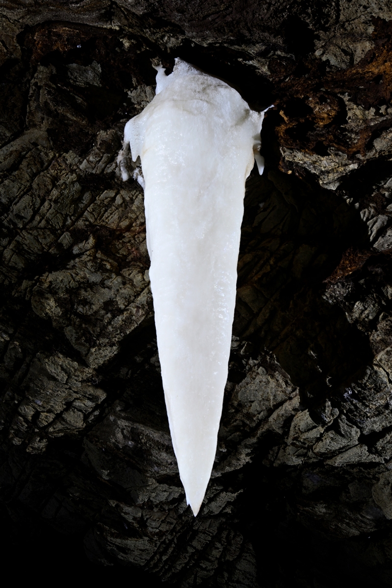 Les stalactites pendent du plafond des cavités Elles sont formées par l'écoulement goutte à goutte à l'extrémité d'une fissure d'une eau chargée en bicarbonate de calcium. La phase initiale correspond à la constitution de concrétions tubulaires monocristallines, appelées fistuleuses, constituées par un tube vertical très fin d'un diamètre extérieur constant. Elles comportent en leur centre un canal continu par où l'eau s'écoule, entraînant ainsi une croissance par leur extrémité. Lorsque ce canal central s’obstrue, la stalactite ne croît alors plus que par les suintements extérieurs au tube, ce qui lui donne une forme plus massive à sa racine et pointue à son extrémité. Les stalagmites sont généralement situésà l'aplomb des stalactites. Le dépôt cristallin de la calcite est favorisé par l'évasion du gaz carbonique dissous lors de l'impact sur le sol. Les colonnes (ou piliers) naissent de la jonction entre stalactites et stalagmites. Leur hauteur peut dépasser une dizaine de mètres.