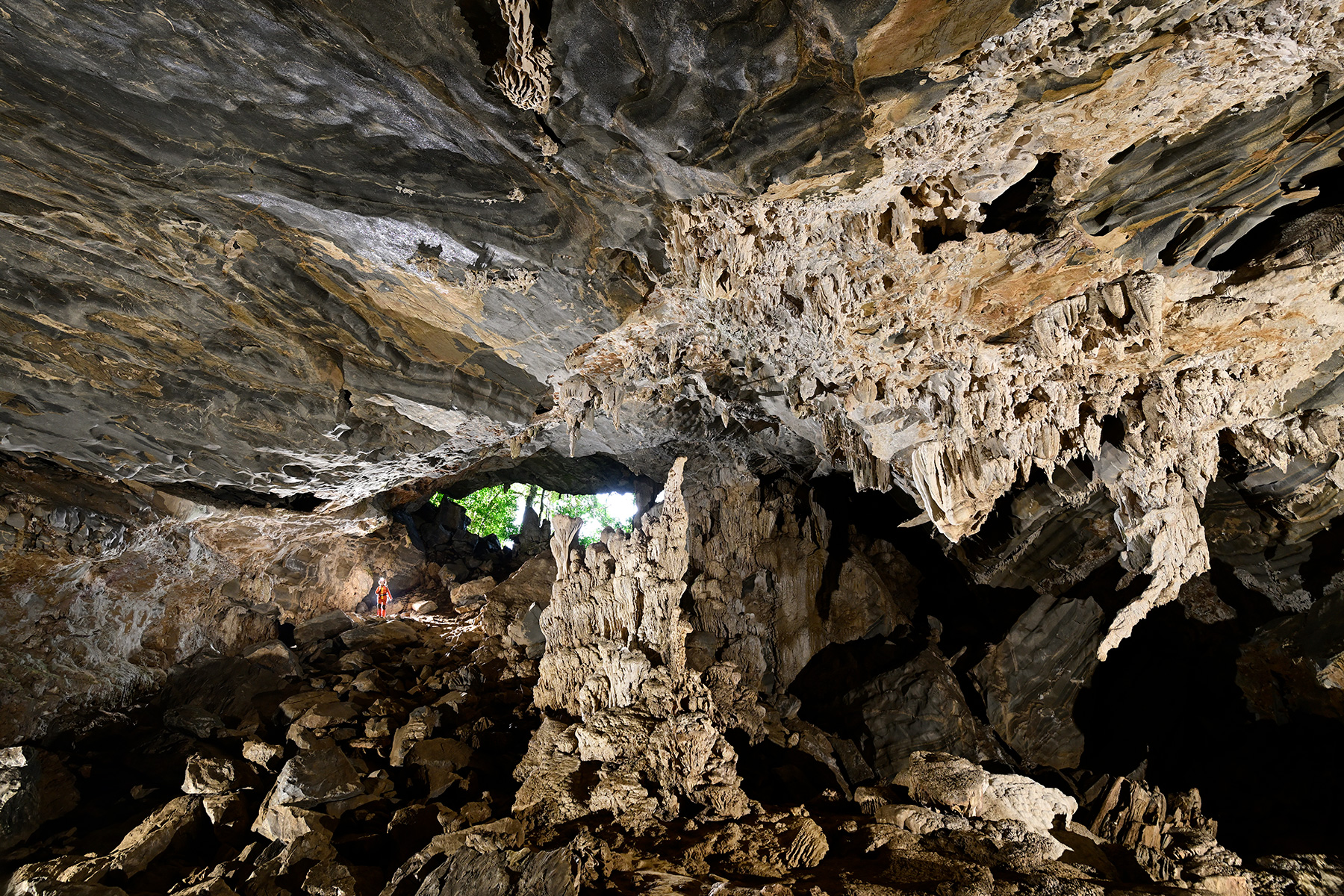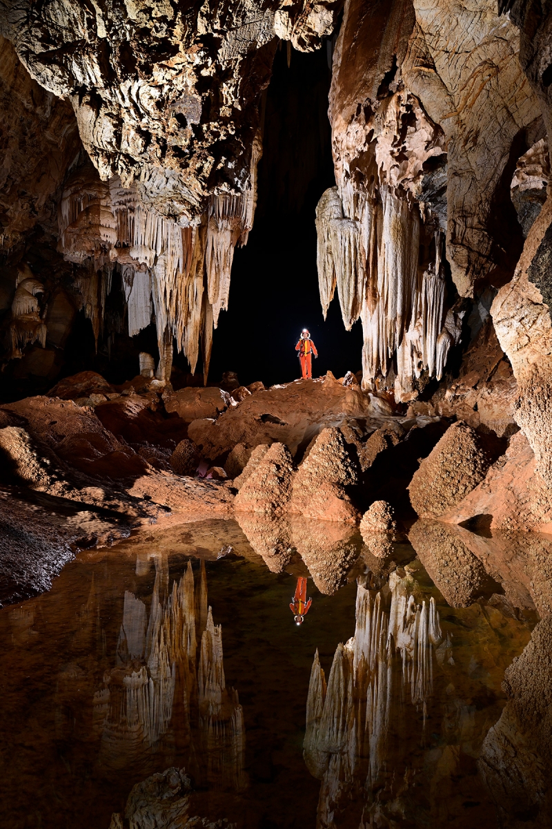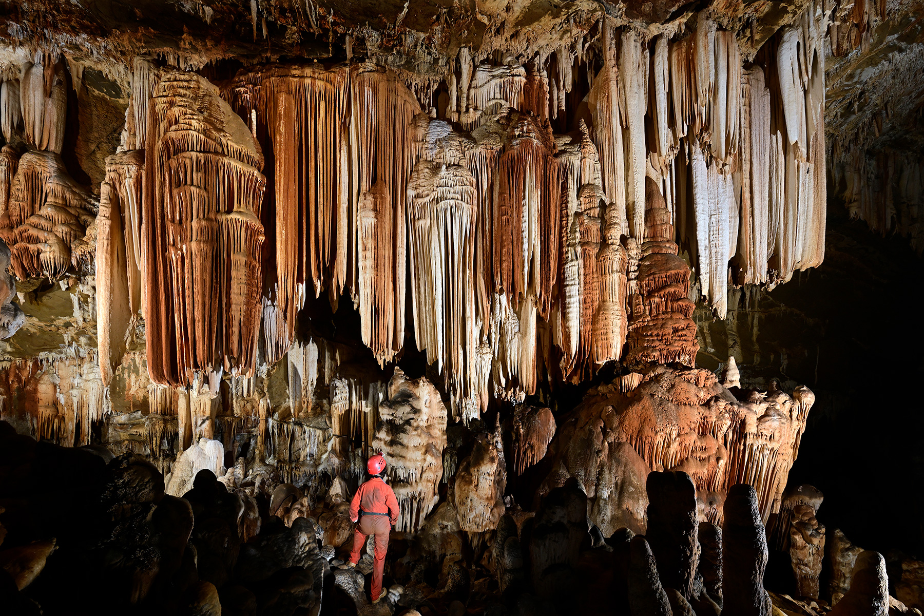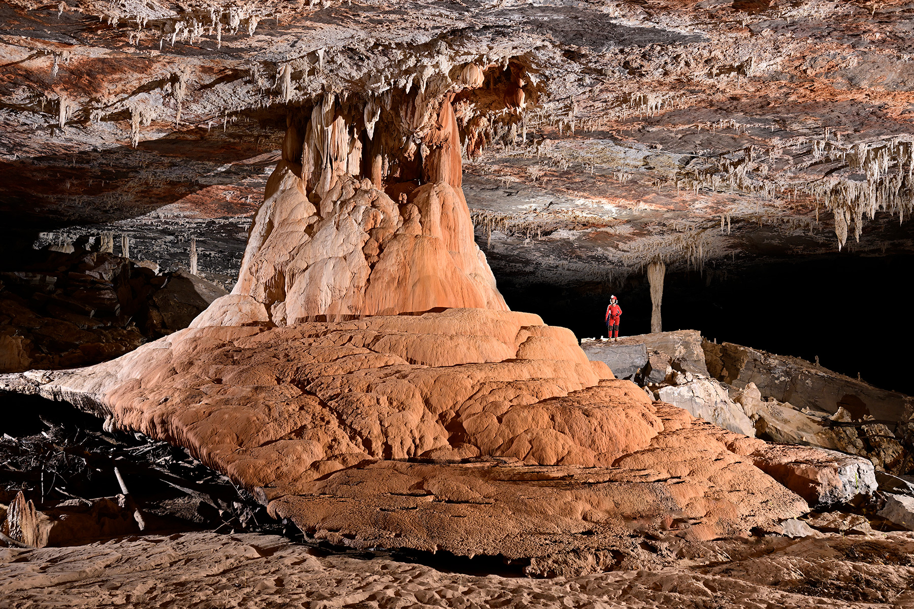 Lapa do Sao Bernardo (Sao Domingos, Goiás) - Grandes coulées de calcite orange au dessus de la rivière.