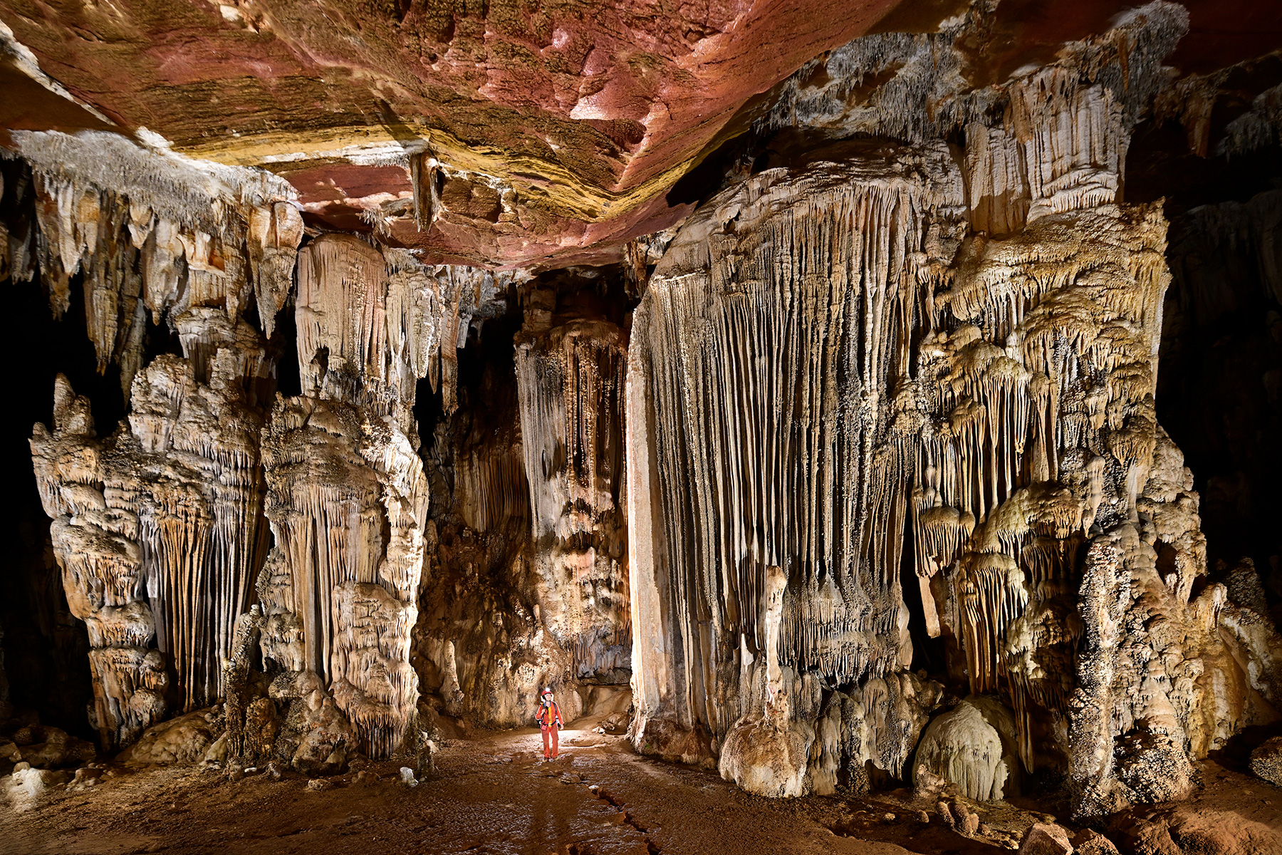 Gecko cave (Botswana) - Galerie avec bouquets de concrétions au plafond (spéléo contre jour)