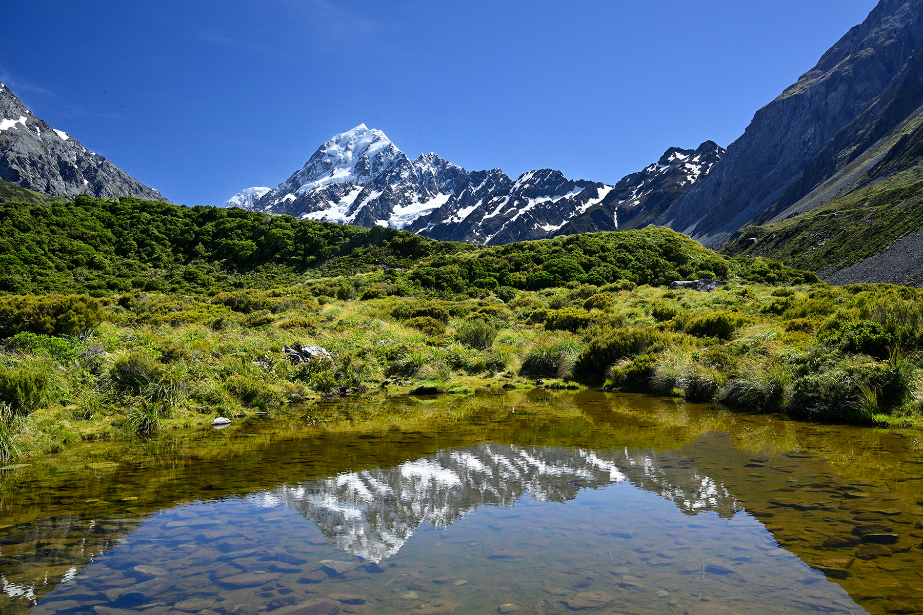 Mont Cook (Nouvelle-Zélande, Ile du sud) - Face est se reflétant dans une mare de Hooker Valley