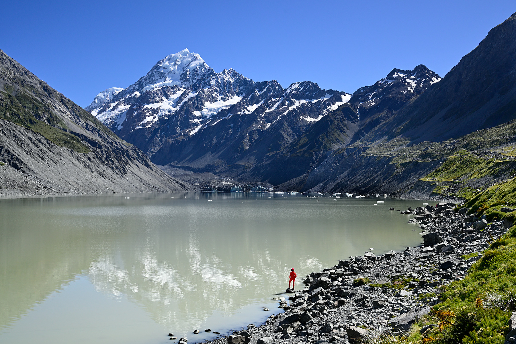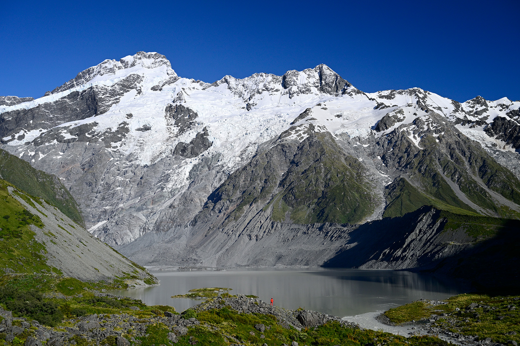 Mont Cook (Nouvelle-Zélande, Ile du sud) - Face est vue depuis Hooker Valley (personnage sur promontoire).